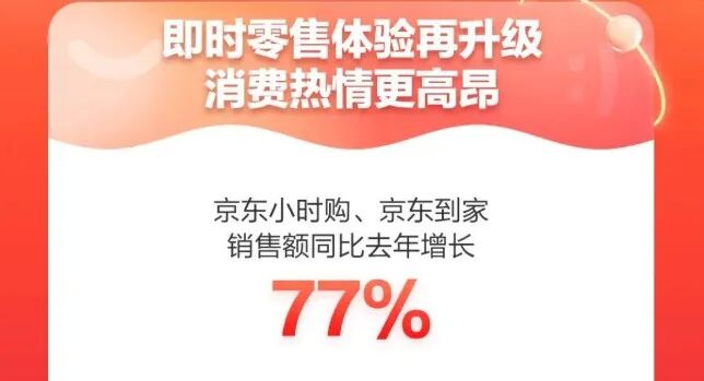 期间,京东小时购、京东到家携手超15万线下实体门店,双渠道销售额同比增长77%,6月18日单日交易额突破6亿元,刷新单日峰值纪录。整个618大促期间,通过京东小时购下单的用户数同比去年增长超400%,单均配送时长缩短4分钟。