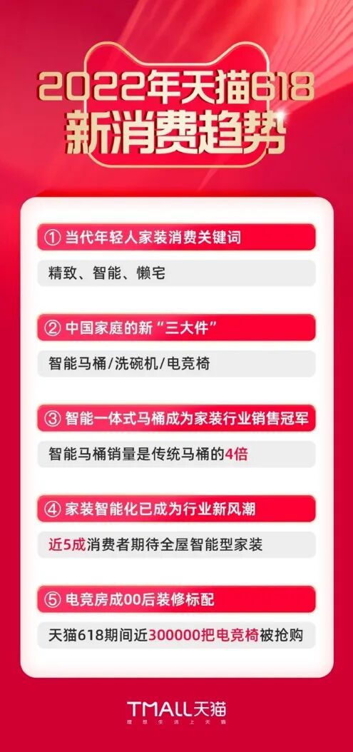 天猫618期间,智能一体式马桶一跃成为家装行业销售冠军,智能型马桶销量更是达到了传统马桶的4倍;近300000把电竞椅被游戏迷们抢购一空。