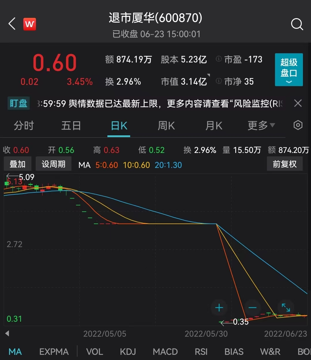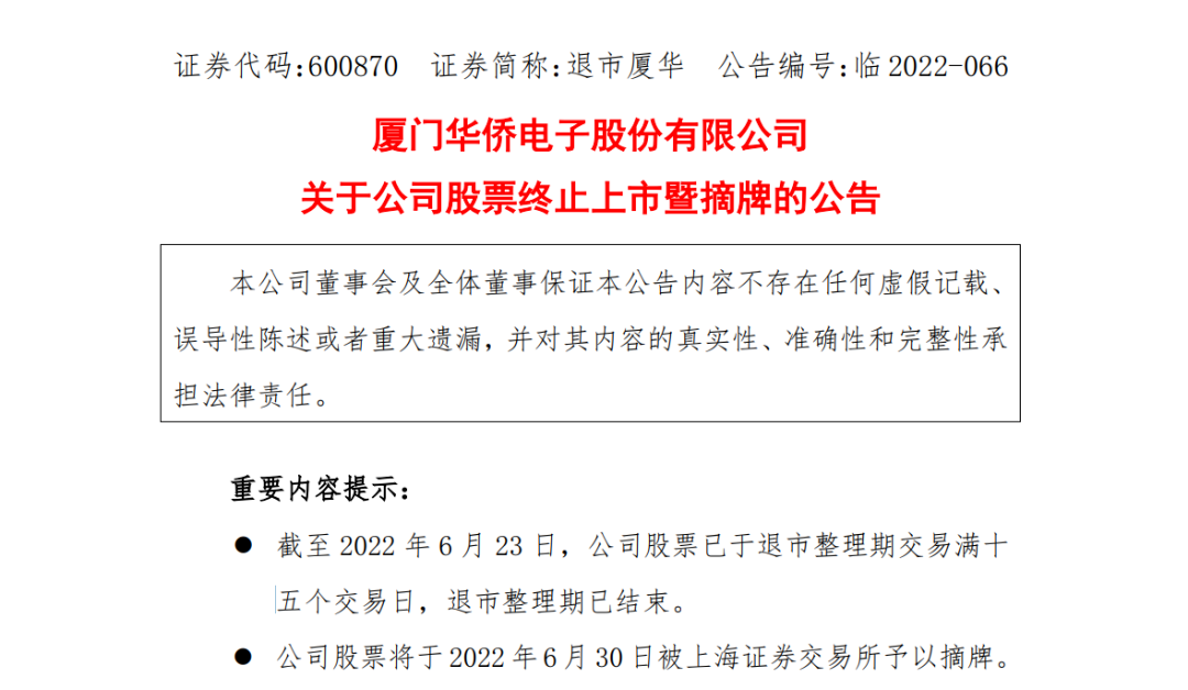 今年5月25日,退市厦华收到上海证券交易所《关于厦门华侨电子股份有限公司股票终止上市的决定》(上海证券交易所自律监管决定书【2022】148号),上海证券交易所决定终止公司股票上市。公司股票于2022年6月2日进入退市整理期交易。