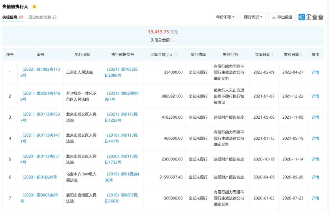 企查查信息显示,目前该公司共关联61条失信被执行人信息,失信总金额约1.94亿元。