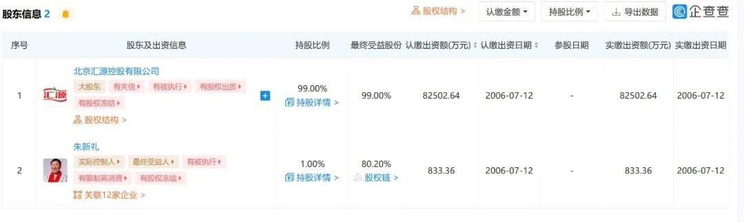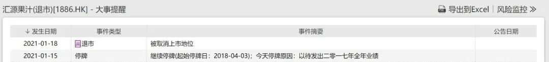 汇源果汁上市公司自2018年3月因债务危机停牌。2019年,朱新礼被法院列为失信被执行人,当年12月,朱新礼作为有权代理人的中国德源资本(香港)有限公司被法院查封,41亿元资产遭冻结。2021年1月18日,汇源果汁的上市地位正式被取消。