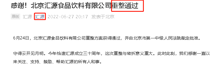 2022年6月27日晚间,汇源微信公众号发布消息称,6月24日,北京汇源食品饮料有限公司重整方案获得通过,并由北京市第一中级人民法院裁定批准。汇源表示,这次重整与转折意义重大。