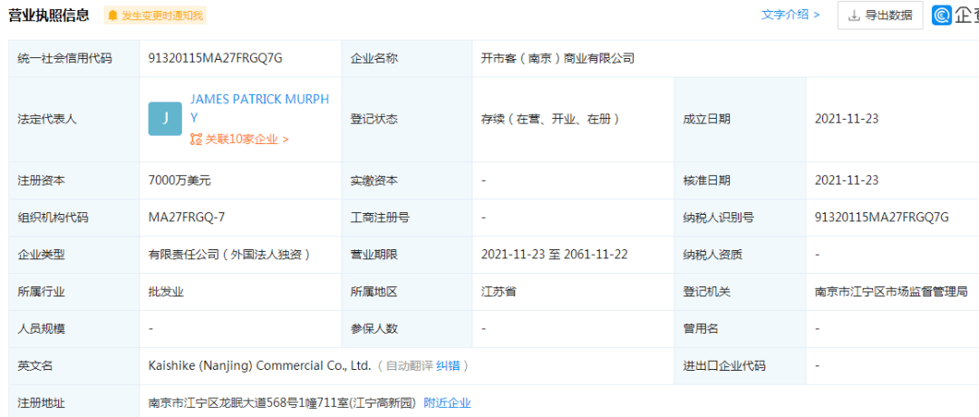 2021年11月,开市客(南京)商业公司已经成立,注册资本高达7000万美元,注册地址位于江宁大学城区域(江宁区龙眠大道568号1幢711室), 公司股东为开市客中国投资有限公司100%持股。