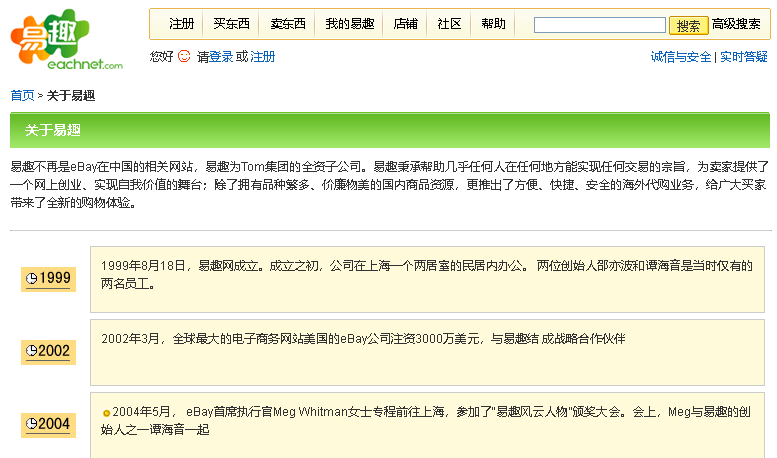 1999年,毕业于哈佛商学院的邵亦波和谭海音回国,创立了“中国版eBay”易趣网。网站成立两个月注册用户就增加到4万人,网上交易额突破1000万,并在成立三个月的时候获得美国三家风投公司的650万美元的投资。