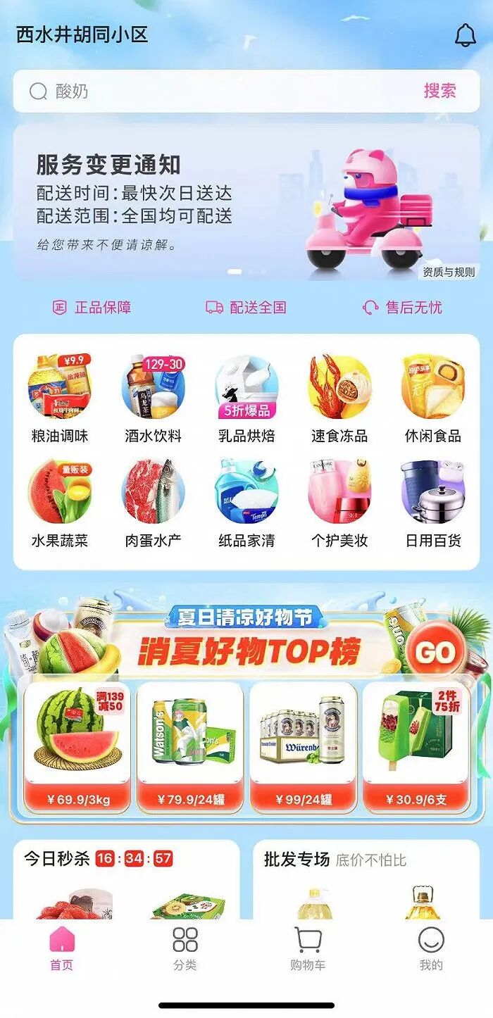 7月28日消息,今日,多位北京地区消费者发现,每日优鲜首页出现服务变更通知,由原本支持30分达改为支持次日达。