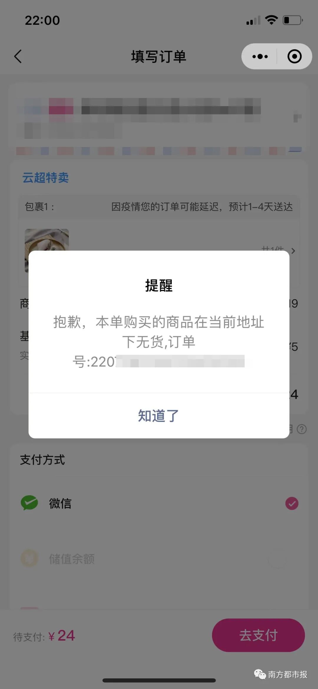 而据南方都市报报道显示,记者收到每日优鲜在广州地区的用户反馈,无论是会员还是非会员用户,晚上十点左右,他们加购的商品已经无法结算,页面显示为“本单购买的商品在当前地址下无货”。