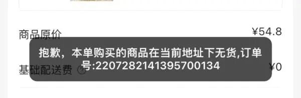 记者对购物车选中的产品进行下单时,界面显示“抱歉,本单购买的商品在当前地址下无货”。