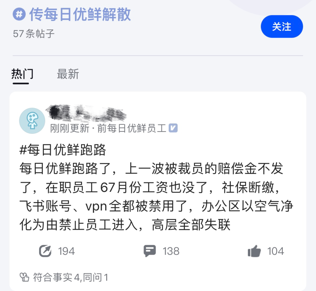 还有标识着“前每日优鲜员工”的网友在另一个职场App上透露,每日优鲜对此前被裁员工承诺的赔偿金也未能赔付,办公区现在以空气净化为由禁止员工进入,高层全部失联。有员工接受媒体采访时表示,单次线上会议人数为300人左右,公司大群剩余人数约为800人。多位员工对此番裁员的处理不满,有意向提交集体劳动裁决。