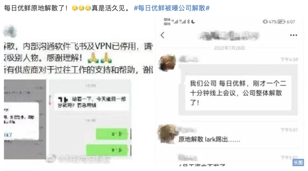 有网友晒出一份聊天记录显示,每日优鲜疑似通过一个20分钟的线上会议宣布解散。同时还晒出一张疑似每日优鲜工作人员的朋友圈,内容显示公司内部通讯软件已停用,并“请各供应商联系老板级别人物”。