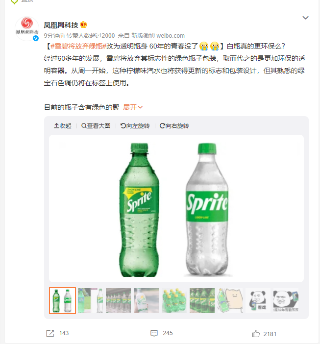 对于雪碧把绿瓶换成透明瓶一事,很多网友表示“为了环保,支持这个决定”。但也有网友惊呼,“自己的青春没了”。
