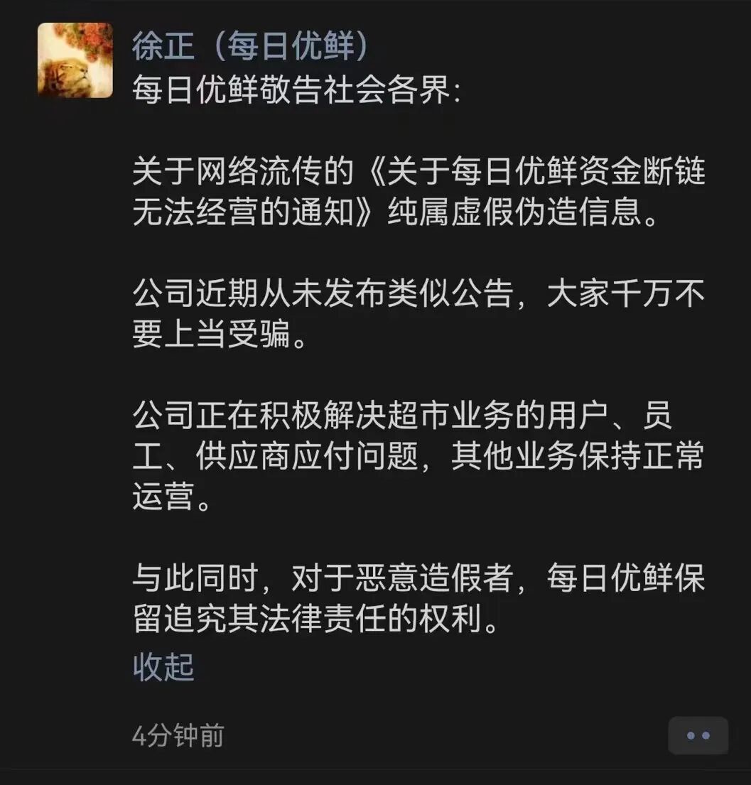 同日,每日优鲜创始人徐正也在朋友圈回应此则网传信息称,关于网络流传的《关于每日优鲜资金断链无法经营的通知》纯属虚假伪造信息。