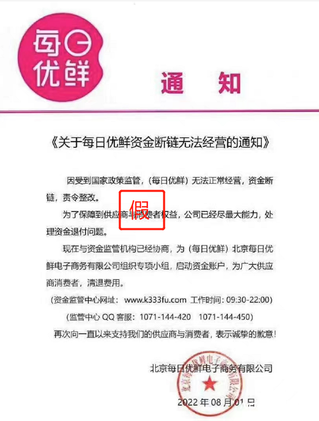 8月1日,有媒体报道,每日优鲜发布了一则公告称“公司已无法正常经营,资金断链,被责令整改”。公告中提到,现在公司已与资金监管机构协商,为北京每日优鲜电子商务有限公司组织专项小组,启动资金账户,为广大供应商消费者,清退费用。