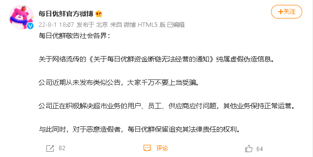 对此,8月1日晚间,每日优鲜官方微博回应称,关于网络流传的《关于每日优鲜资金断链无法经营的通知》纯属虚假伪造信息。公司近期从未发布类似公告,大家千万不要上当受骗。