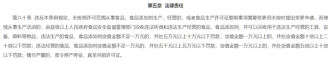 “ 违反本条例规定,未按照许可范围从事食品、食品添加剂生产、经营的,或者食品生产许可证载明事项需要变更但未按时提出变更申请,而继续从事生产活动的,由县级以上人民政府食品安全监督管理部门没收违法所得和违法生产经营的食品、食品添加剂,并可以没收用于违法生产经营的工具、设备、原料等物品;违法生产的食品、食品添加剂货值金额不足一万元的,并处五万元以上十万元以下罚款,货值金额一万元以上的,并处货值金额十倍以上二十倍以下罚款;违法经营的食品、食品添加剂货值金额不足一万元的,并处五千元以上五万元以下罚款,货值金额一万元以上的,并处货值金额五倍以上十倍以下罚款;情节严重的,责令停产停业,直至吊销许可证。”