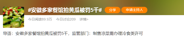 近期,在安徽池州一论坛上,也有餐饮店老板发帖反映,称自己在店内“拍黄瓜”做凉菜被市场监管部门处罚5000元。