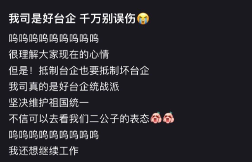 在这次对台湾省事情中,就旺旺在这件事情的发声来看,可以看到其求生欲满满。首先就是强烈表明自己是好台企,一字一句都表现着强烈的爱国之心,甚至还存在着些许的卑微,让网友们直呼有趣。
