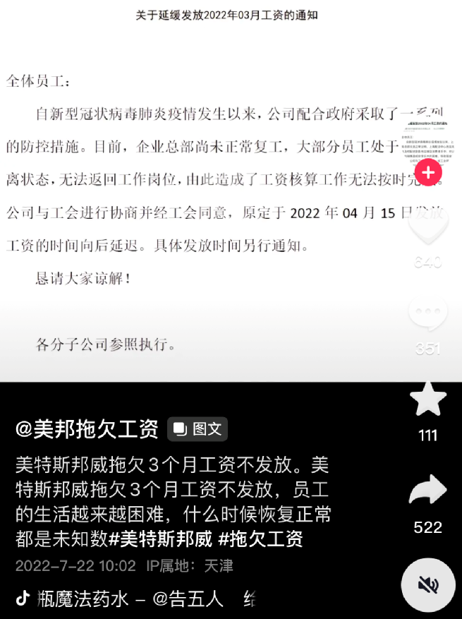 此后,公司又于7月发布了延缓发放6月工资的通知,原因依旧是疫情影响公司经营而导致的现金流紧张。