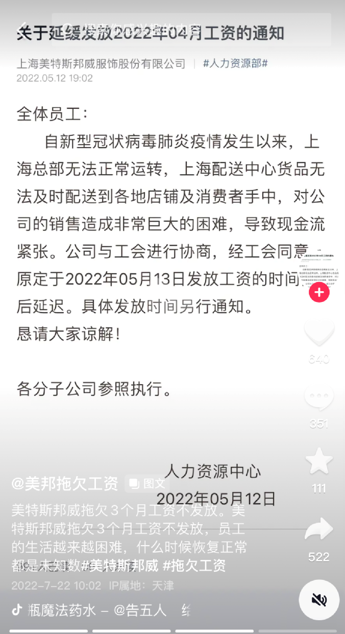 不过到了5月,美特斯邦威又发布通知,表示由于上海总部无法正常运转,上海配送中心货品无法及时配送到各地店铺及消费者受众,对公司的销售造成非常巨大的困难,导致现金流紧张,经工会同意,将延缓发放4月的工资。