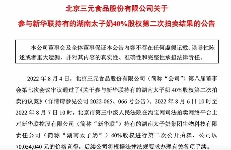 日前,北京市第三中级人民法院在淘宝网司法拍卖网络平台对新华联控股有限公司持有的湖南太子奶40%股权进行第二次公开拍卖,乳企三元股份通过参与竞拍的方式,以7005.4万元的价格竞得太子奶40%股权。