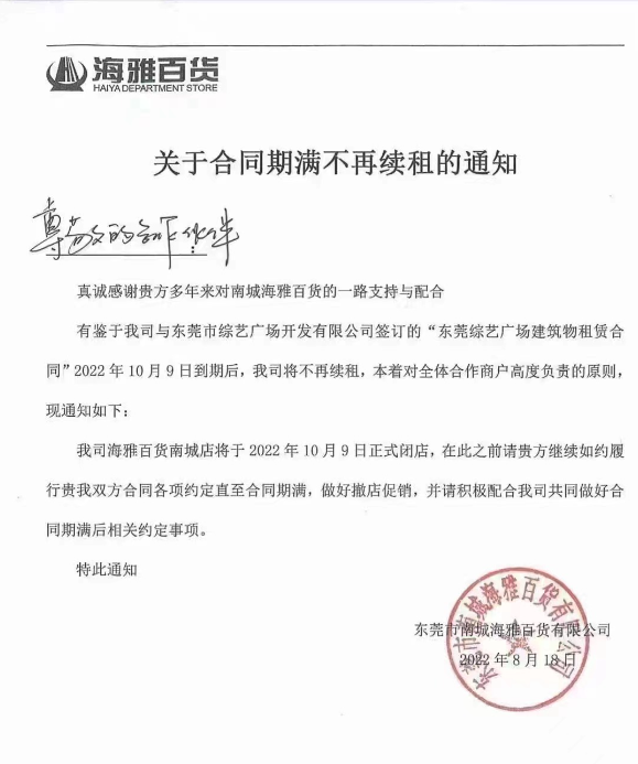 公告显示,鉴于公司与东莞市综艺广场开发有限公司签订的“东莞综艺广场建筑租赁合同”2022年10月9日到期后不再续约,将关闭海雅百货南城店,商户做好撤店事宜。