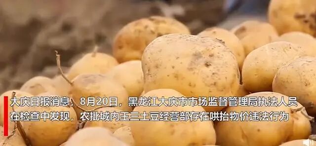 8月31日,据大庆日报报道,近日,黑龙江省大庆市市场监督管理局执法人员在检查中发现,农批城内王三土豆经营部存在哄抬物价违法行为。经查,该经营部进价1.2元/斤的土豆,售价从1.4元/斤涨至2元/斤,最高进销差价率达66.66%。