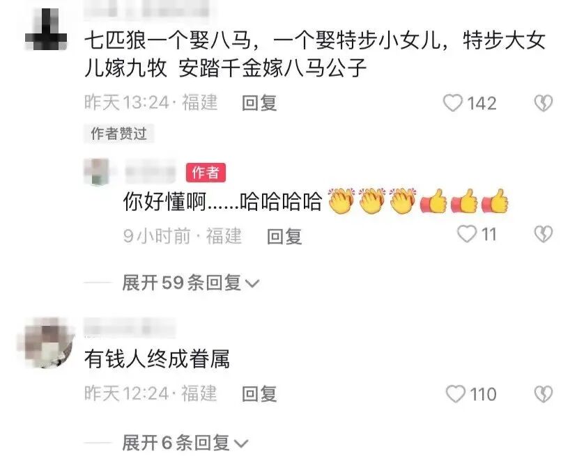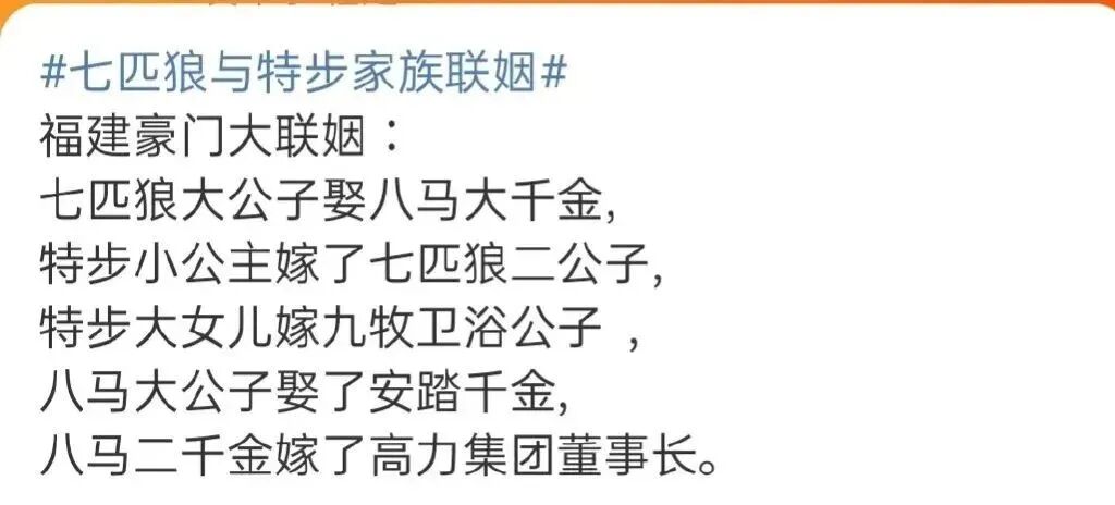 还有网友总结了一下近几年福建当地豪门的联姻情况。粗略地统计了一下,八马家族的三位亲家七匹狼、安踏、高力控股的身家合计超过500亿。而特步家的两位千金又串联起了七匹狼、九牧卫浴家族。这6大家族的身家至少超过600亿。