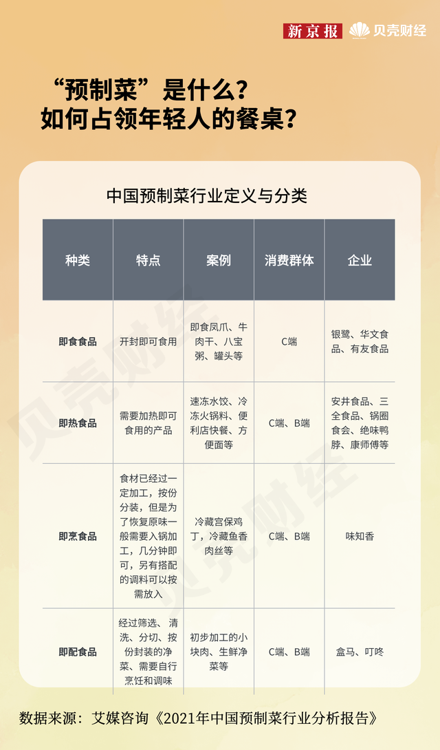 资料显示,预制菜,顾名思义,是指以农、畜、禽、水产品为原料,配以各种辅料,经预加工而成的成品或半成品。通过需要加工的程度多少分为即食食品、即热食品、即烹食品、即配食品。