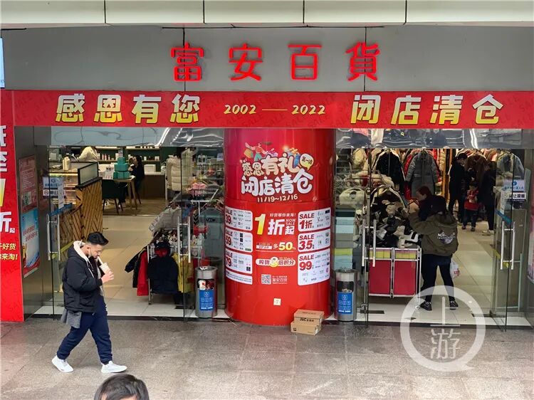 上游新闻记者在现场看到,目前商场仍正常运营,大部分商户忙着清仓甩卖,“感恩有礼 闭店清仓”“1折起,好货等你来淘”等海报在店内随处可见。工作人员也不时提醒顾客,“商场电子会员卡这个月底要清零,里面的积分赶紧用哟。”