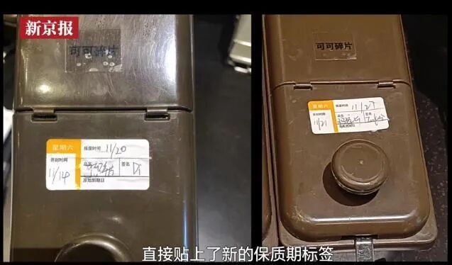 11月21日,@新京报 记者在星巴克无锡昌兴大厦店卧底发现,店内用于制作“星冰乐”的可可碎片已经过期。保质期标签信息显示它于11月14日开封,11月20日到期,不过值班主管发现后没有将其报废,而是撕下保质期标签,直接换了个新的标签。新的保质期标签显示,它的过期时限被延后了整整一周。