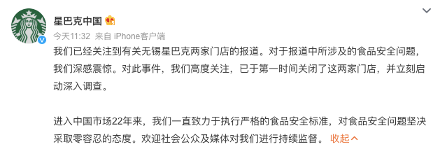 12月13日,@星巴克中国 发布声明称,“我们已经关注到有关无锡星巴克两家门店的报道。对于报道中所涉及的食品安全问题,我们深感震惊。”星巴克称,已于第一时间关闭这两家门店,并立刻启动深入调查。