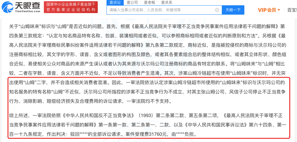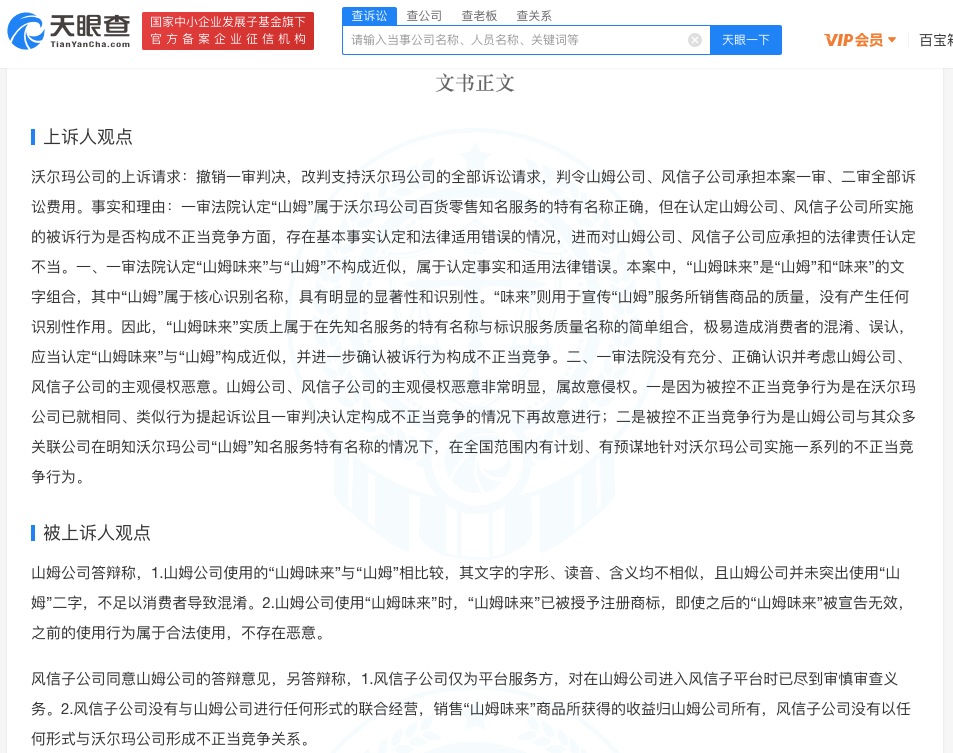 据文书显示,沃尔玛曾起诉山姆冷链超市店铺名称使用“山姆”、销售“山姆味来”商品构成对沃尔玛知名服务特有名称“山姆”的侵权。一审法院认定,“山姆味来”与“山姆”不构成近似,沃尔玛公司的指控不成立,驳回其诉讼请求。
