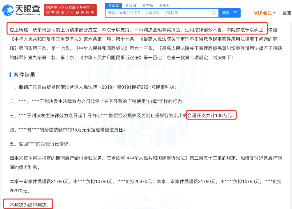 二审判决结果为:撤销一审判决,山姆冷链公司停止在其店铺使用“山姆”字样,赔偿沃尔玛公司经济损失等共计100万元,风信子公司对赔偿数额中的15万承担连带赔偿责任。