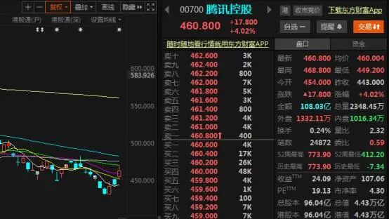 消息一出,腾讯控股股价应声大涨,12月23日盘中涨超5%,截至午间休市报价460.8港元/股,涨幅4.02%。