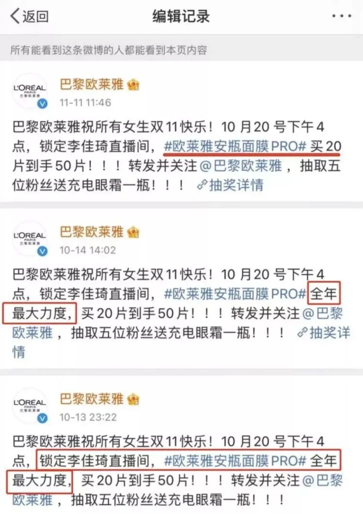 据悉,巴黎欧莱雅10月13日、14日在官方微博称李佳琦直播间将会是全年最大优惠。但11月11日上述微博内容已删去“全年最大力度”的字眼。