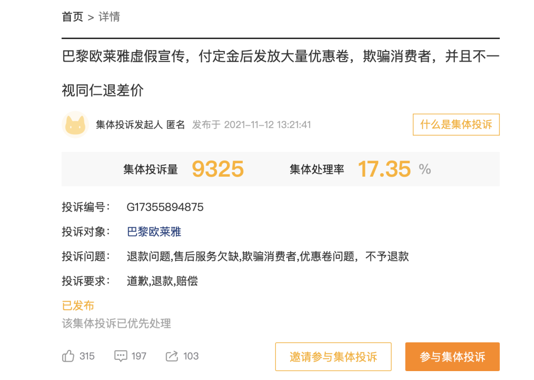 在“黑猫投诉”平台上,有消费者投诉称,巴黎欧莱雅虚假宣传,付定金后发放大量优惠券,欺骗消费者,并且不一视同仁退差价。