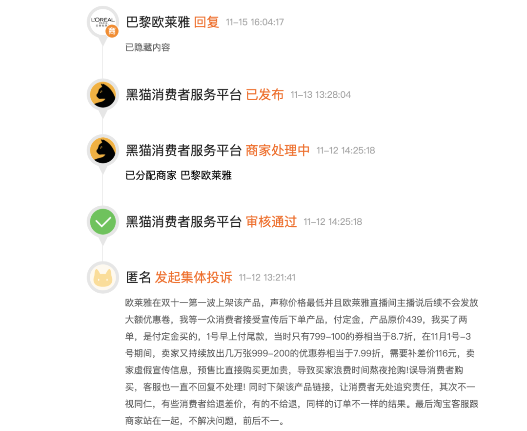 平台一位匿名消费者表述:欧莱雅在“双11”第一波上架,声称价格最低并且欧莱雅直播间主播说后续不会发放大额优惠券,消费者接受宣传后下单产品,付定金,产品原价439元,买了两单,是付定金买的,11月1日早上付尾款,当时只有799减100的券相当于8.7折。