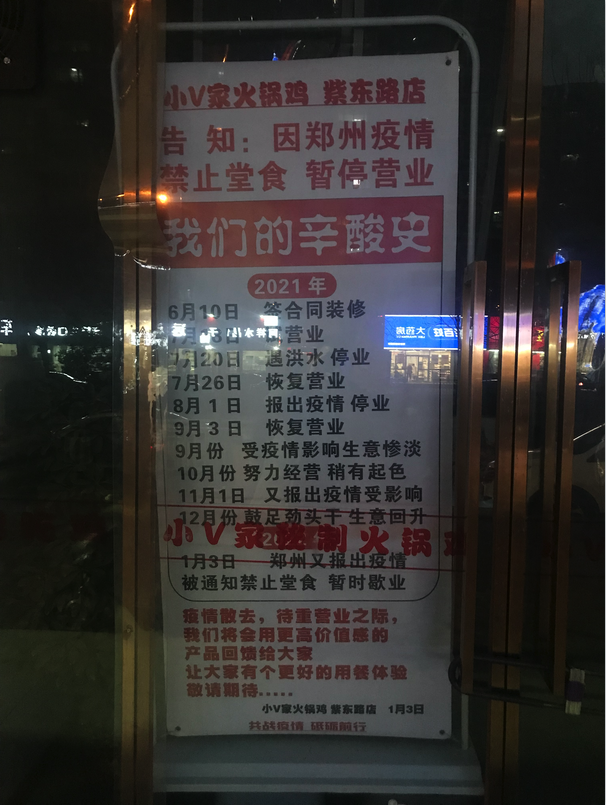 这张写满“辛酸史”的停业通知意外走红网络。该店老板表示,开业半年,先是遇上郑州“7·20”特大暴雨停业,又接连经历疫情,总共停业3次,亏了几十万。目前,火锅店遇到股东提出退股、续交房租、供应商结账款等各种压力,资金链十分吃紧。
