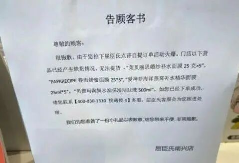 然而,不少薅到羊毛的消费者去线下提货时,却被告知“没货”,有的门店还贴出了告示,表示因订单活动火爆,部分一分钱面膜产品已经缺货,无法提货,希望消费者联系官方客服解决问题,门店则准备了小礼品以表歉意。