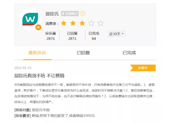 黑猫投诉平台显示,近三十天内,屈臣氏投诉量已超2800起,且大部分为面膜疑似有货不让核销问题。