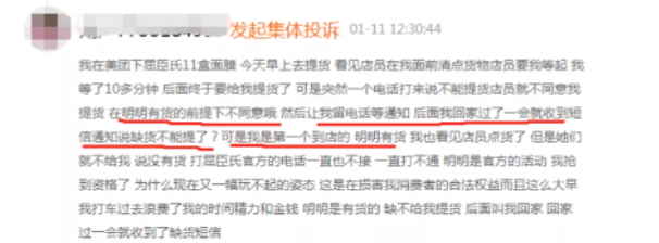 但消费者对此并不满意,根据黑猫投诉平台,有消费者反映在自己接到短信通知后,第一个去门店提货,等了10多分钟终于可以提货,店员忽然接到电话不让提货了,怀疑门店是在有货的前提下拒绝消费者提货,认为屈臣氏官方搞活动最后却“玩不起”,浪费了自己的时间和金钱。