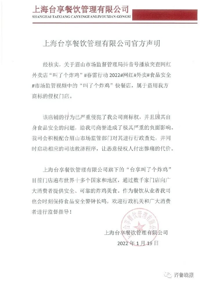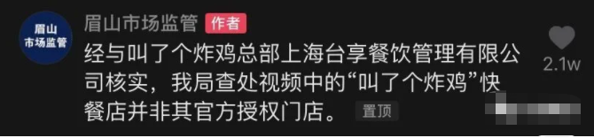 1月20日下午,“眉山市场监管”视频账号做出最新补充:经与“叫了个炸鸡”总部上海台享餐饮管理有限公司核实,本次查处视频中的“叫了个炸鸡”快餐店并非其官方授权门店。