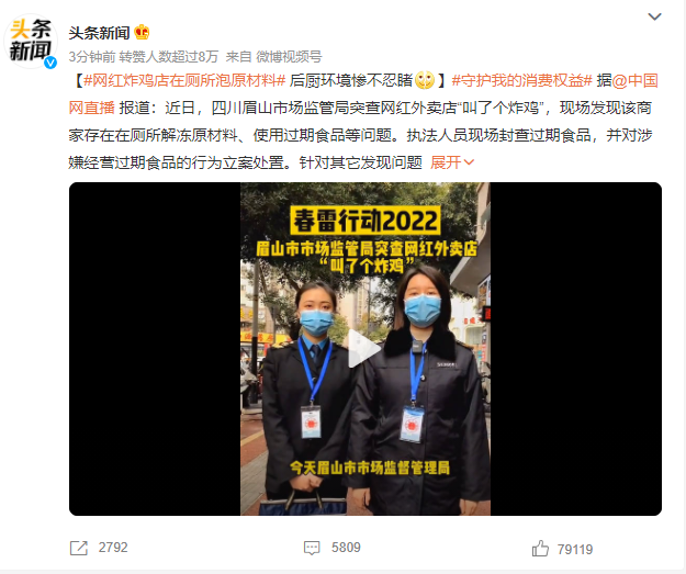 导读:厕所池里泡冻鸡?叫了个炸鸡回应!