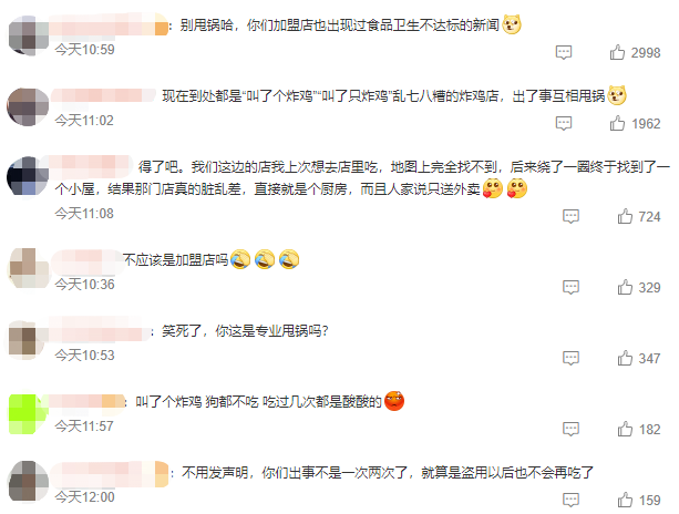 对于官方回应,网友纷纷表示:此举有“甩锅”的嫌疑,表示之前“叫了个炸鸡”加盟店也曾爆出食品安全问题。