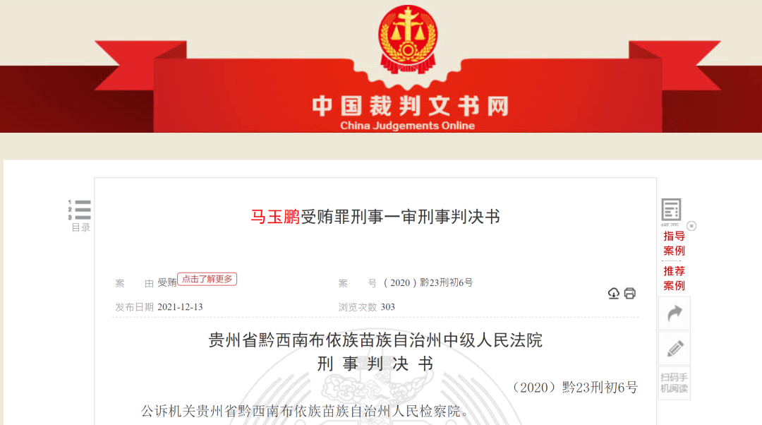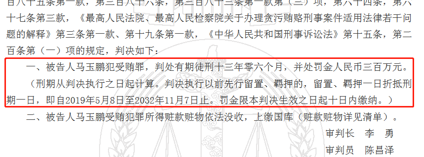 最终,一审法院判决马玉鹏犯受贿罪,判处有期徒刑十三年零六个月,并处罚金人民币300万元。马玉鹏受贿犯罪所得赃款赃物依法没收,上缴国库。