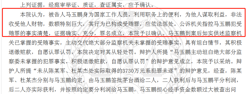 不过,马玉鹏到案后如实供述监察机关已掌握的受贿事实,主动交代绝大部分监察机关未掌握的受贿事实,具有坦白情节,其积极退缴赃款,自愿认罪认罚,法院决定对其从轻处罚。