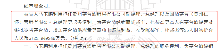 经过调查发现,马玉鹏利用担任贵州茅台酒销售有限公司副经理、总经理以及国酒茅台(贵州仁怀)营销有限公司总经理的职务便利,为茅台酒经销商陈某军、杜某杰等25人在茅台酒经营及签批零售茅台酒、增加茅台酒供应量等事项上谋取利益,收受陈某军、杜某杰等25人财物共计人民币6722.95万元。