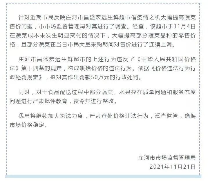 针对近期市民反映庄河市某生鲜超市借疫情之机大幅提高蔬菜售价问题,市市场监督管理局对其进行了调查。经查,该超市于11月4日在蔬菜成本未发生明显变化的情况下,大幅提高部分蔬菜品种的零售价格,且部分蔬菜在当日市民大量采购期间对售价进行了连续上调。