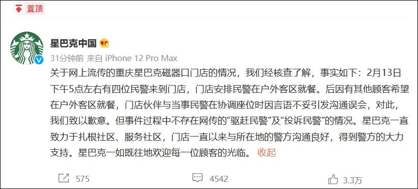 “关于网上流传的重庆星巴克磁器口门店的情况,我们经核查了解,事实如下:2月13日下午5点左右有四位民警来到门店,门店安排民警在户外客区就餐。后因有其他顾客希望在户外客区就餐,门店伙伴与当事民警在协调座位时因言语不妥引发沟通误会,对此,我们致以歉意。但事件过程中不存在网传的“驱赶民警”及“投诉民警”的情况。星巴克一直致力于扎根社区、服务社区,门店一直以来与所在地的警方沟通良好,得到警方的大力支持。星巴克一如既往地欢迎每一位顾客的光临。”