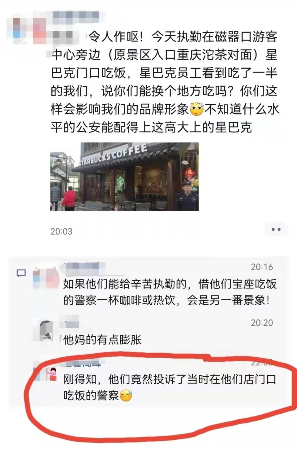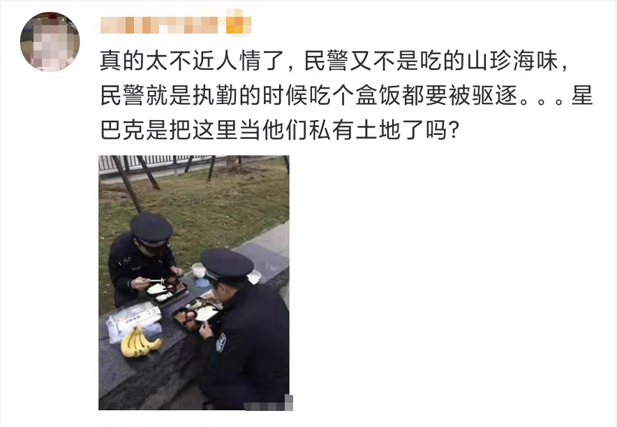 真是咄咄怪事!执勤民警在门店门口吃盒饭,就妄加驱赶,谁给的权力?嫌驱赶不过瘾,还要投诉民警,谁给的底气?如果此事属实,该被投诉的是星巴克。
