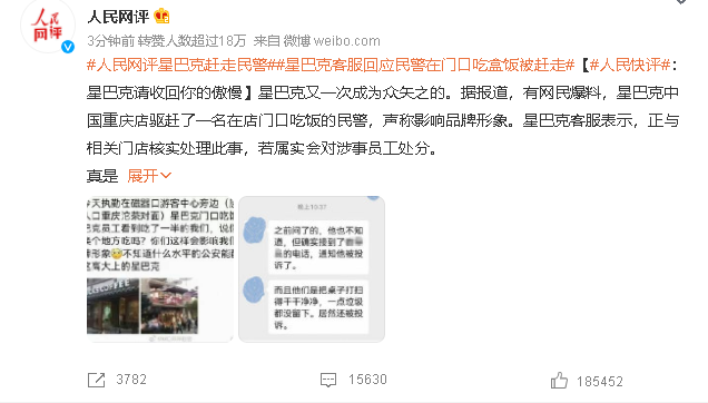 2月13日,有网友发帖称“重庆星巴克劝离在门店门口吃饭民警”,相关内容引发热议。